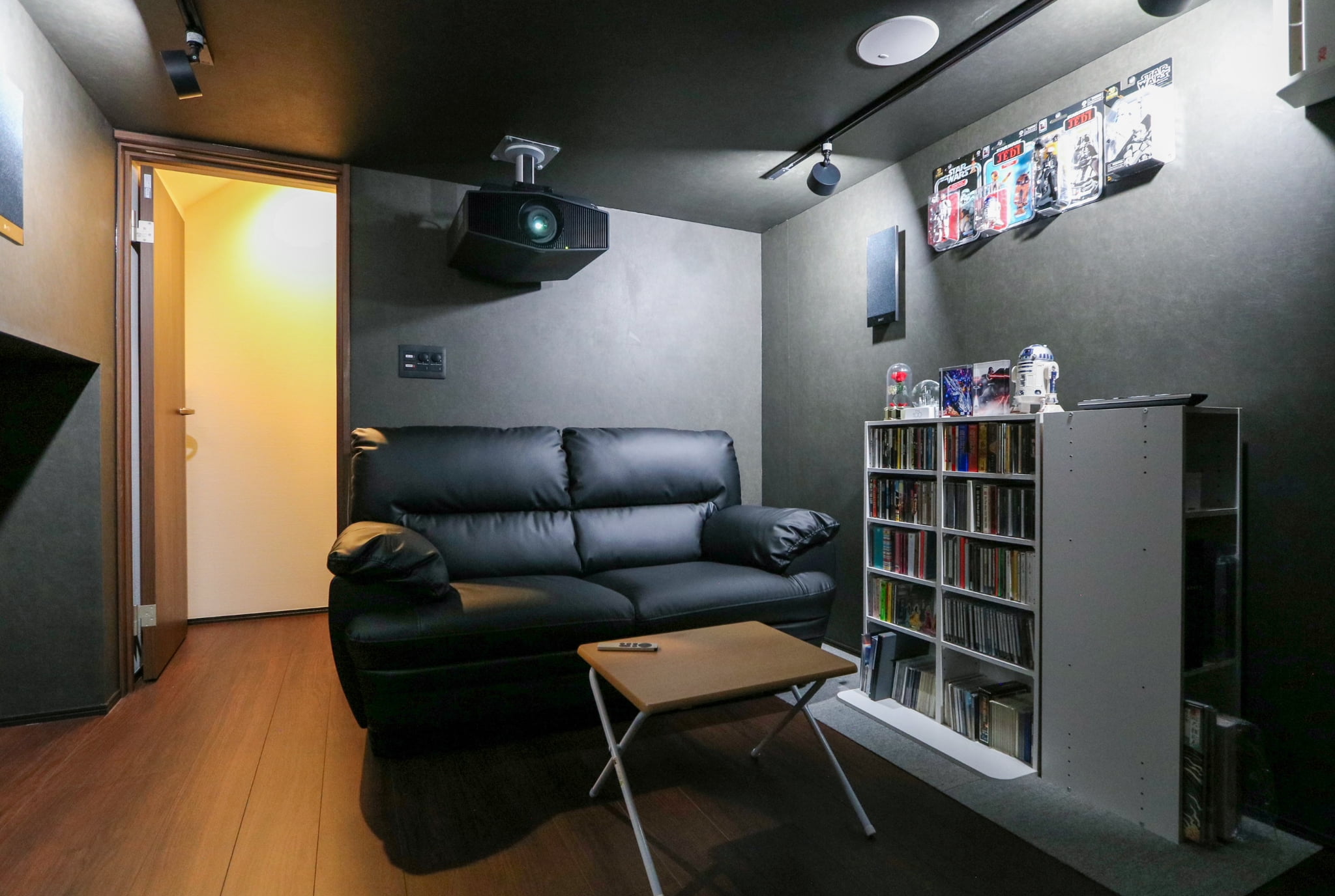 ご家族で籠って過ごすことのできるシアタールーム。照明やサウンドシステムにもこだわり、趣味を思う存分満喫できる遊び心満載のスペースを造りました。