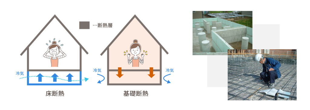 「基礎断熱」は床下も室内空間のひとつと考え、床下を断熱材で覆う施工方法です。