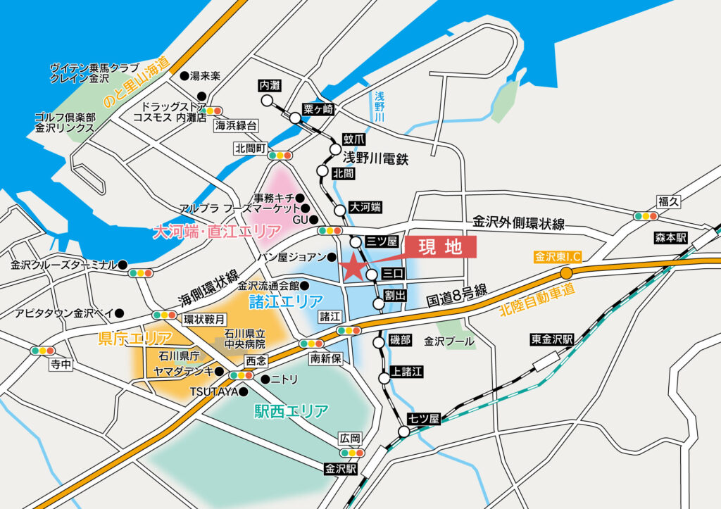 また、国道8号線へのアクセスも同じ距離。8号線からの北陸自動車道金沢東ICもスムーズに行くことができます。