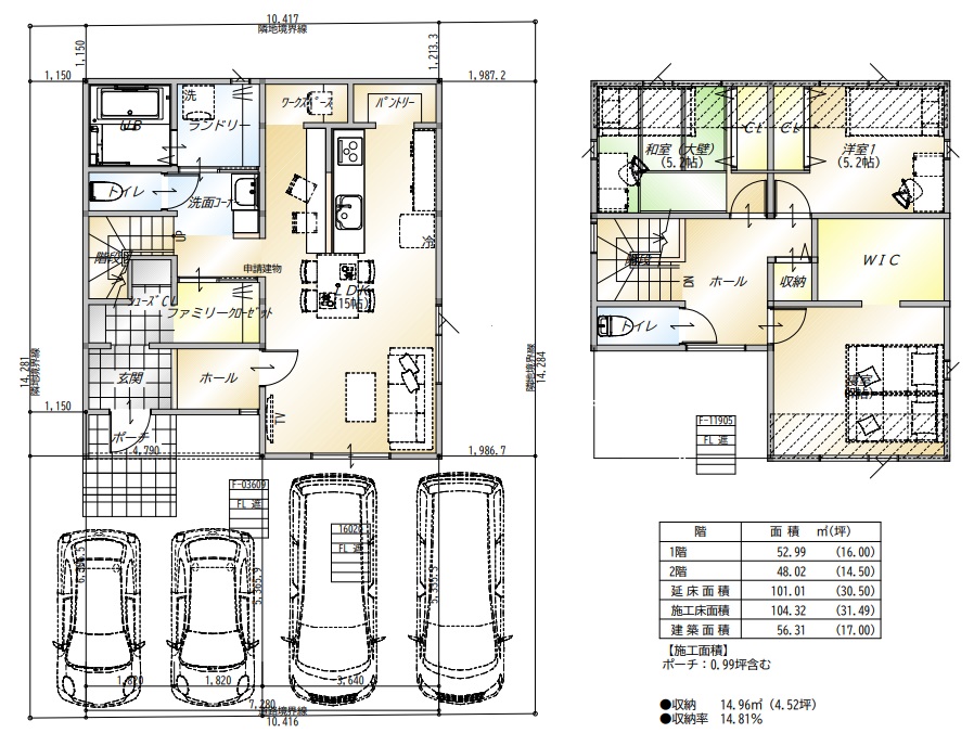 3LDK+シューズクローク+ファミリークローク+パントリー+ランドリーと要望の居室数と収納が無駄なく納まっています。