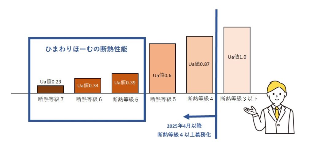 ひまわりほーむの建物は断熱性能が高くUa値0.39以下。この数値は2024年4月より義務化されるUa値0.87よりも高く、さらにはZEH住宅のUA値0.6から見ても高い数値となっております。