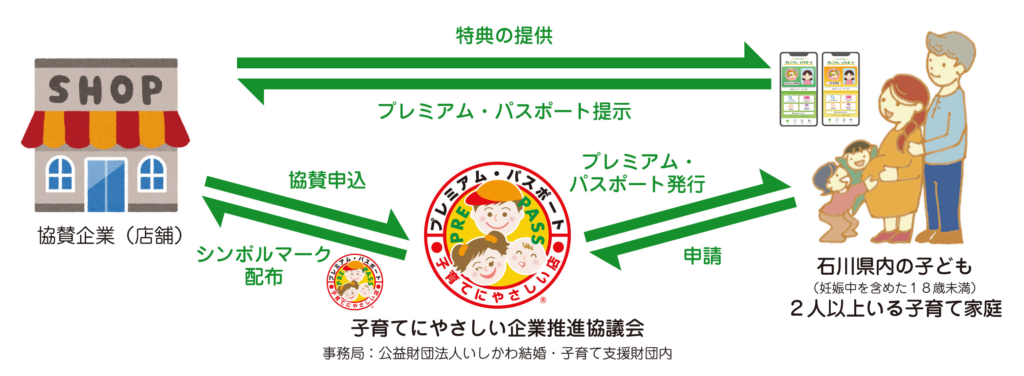 プレミアム・パスポート事業は、子育てを社会全体で支えることを目的に、妊娠中の子を含めて2人以上のお子さん(満18歳未満)がいる石川県内のご家族を協賛企業が支援する制度です。