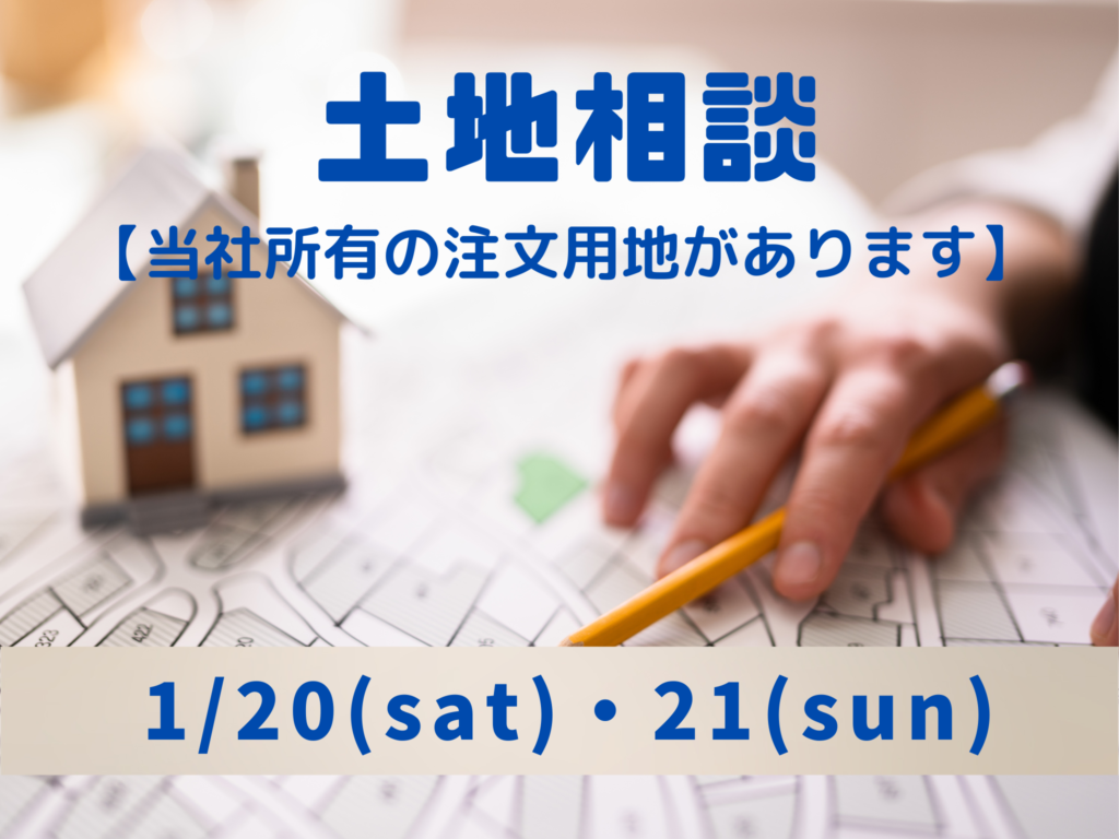 開催日時 : 1月13日(土),14(日),20(土),21(日) ※当日予約OK 注文住宅で建てたいけど土地探しでお困りの方へ 建売ではなく注文住宅で家を建てたいけど、肝心の土地探しに苦労している方不動産会社へ行く前に、まずは注文住宅の会社へご相談ください注文住宅の会社であれば、お客様のご希望の間取り、建物サイズに合わせた土地探しが可能ですまた、土…