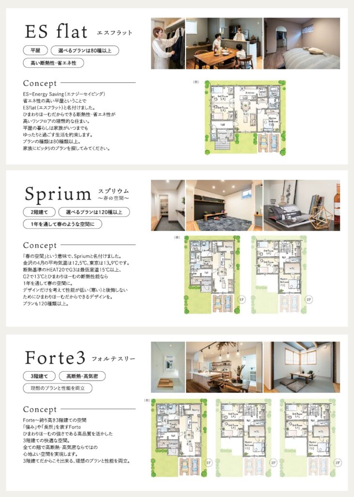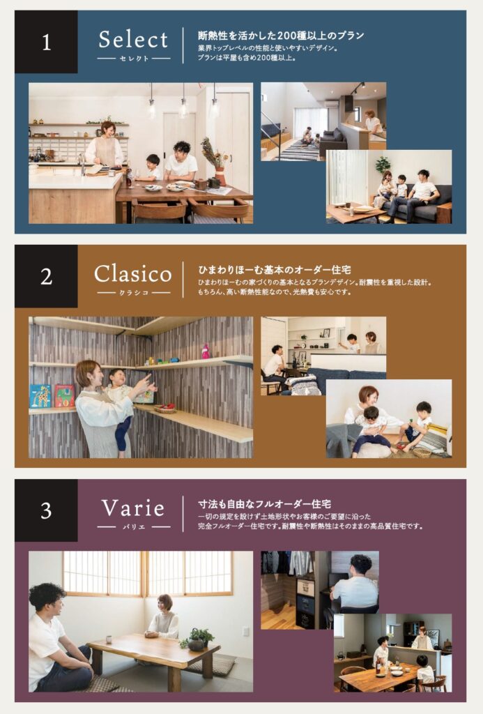 相談会ではお客様の生活スタイル、理想の間取りプラン、お好みのデザイン、ご予算などをお聞きしてお客様にあわせた組み合わせをご提案します。断熱仕様×プランデザインの組み合わせで全9パターンからお選びいただけます。自分の生活スタイルに合わせて組み合わせしてください。