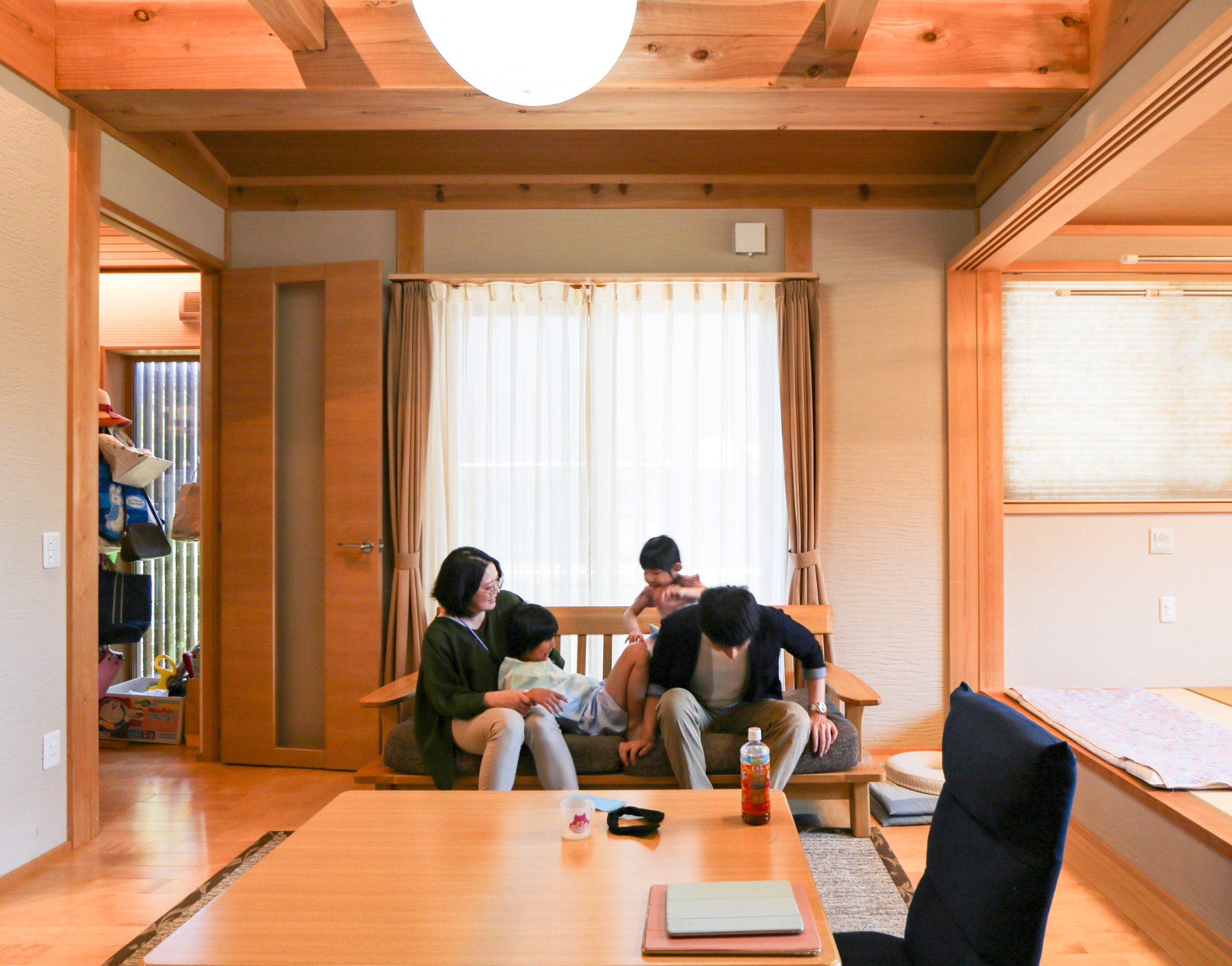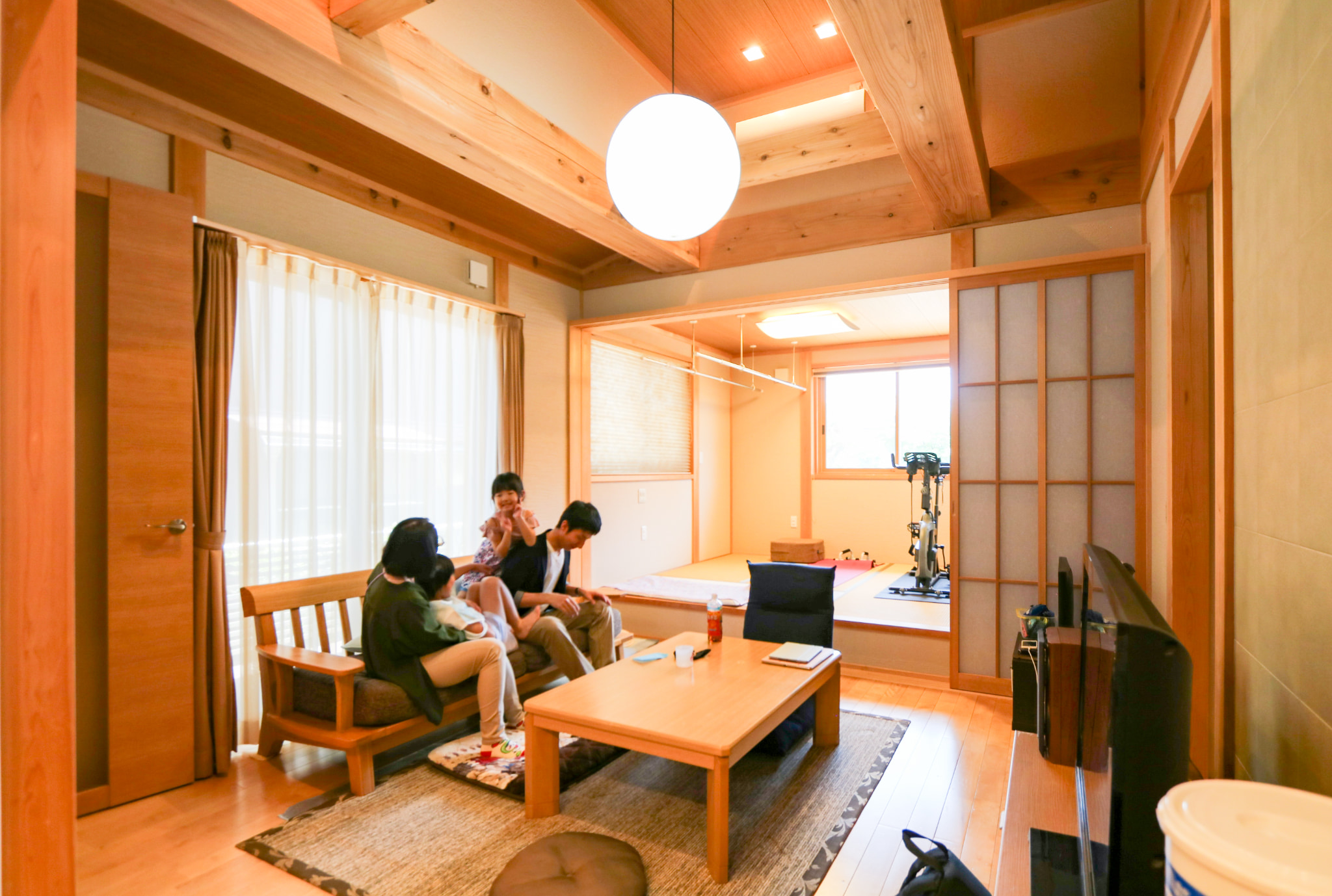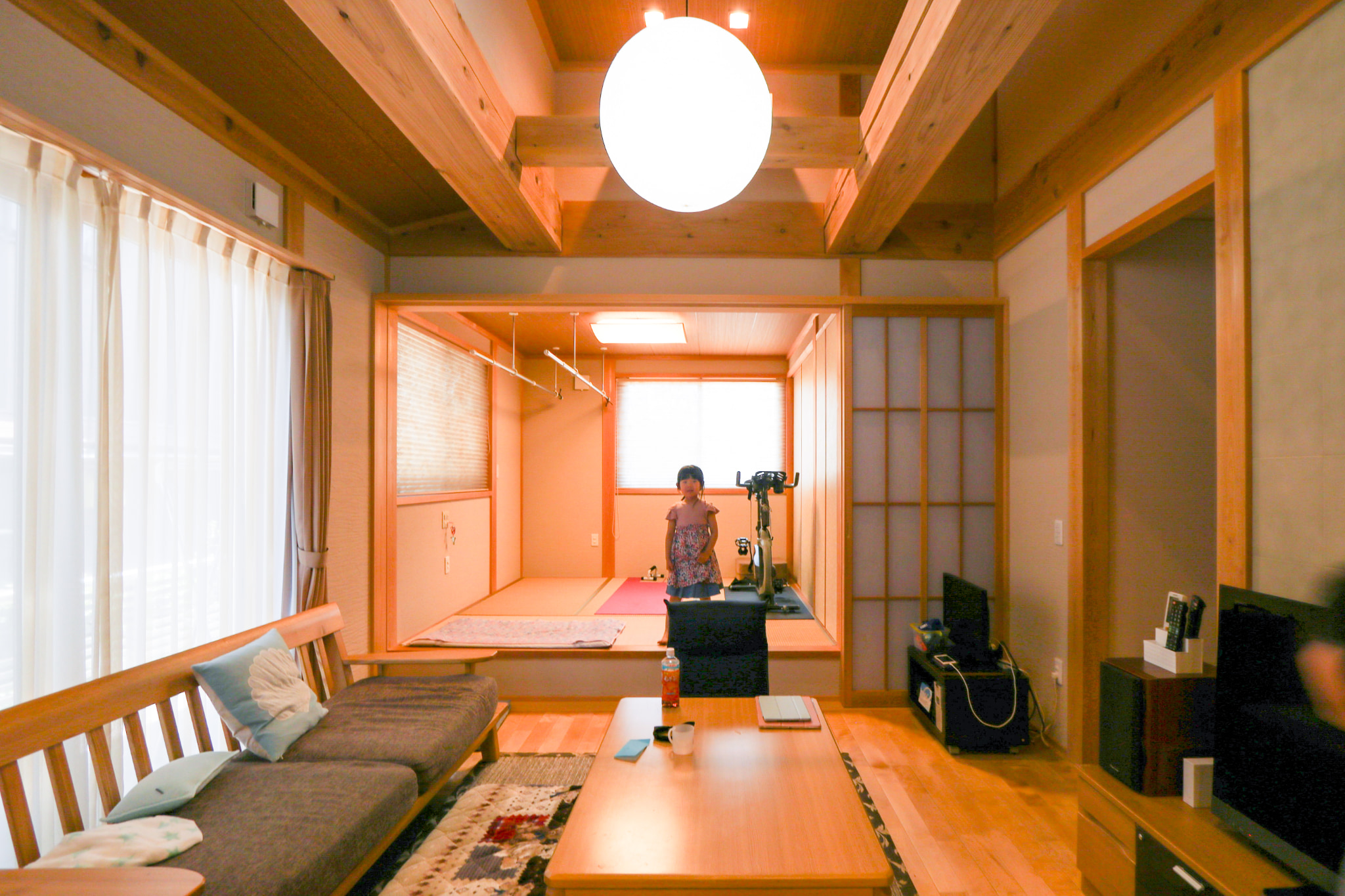 奥様 : 部屋の仕切りを少なくして、天井を高くして梁を見せることによって、リビングの空間を広く感じられるところです。